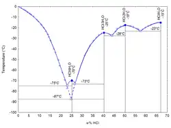 Formează un amestec azeotrop cu apa ce conține 20,24% HCl și distilă la 110 °C.[25]