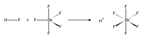 HF eliberează un proton (H+), iar baza sa conjugată (F−) intră în structura anionului SbF−