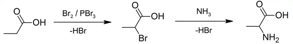 - ↑ Tobie, Walter C.; Ayres, Gilbert B. (). „Synthesis of d,l-Alanine in Improved Yield from α-Bromopropionic Acid and Aqueous Ammonia”. Journal of the American Chemical Society. 59 (5): 950. doi:10.1021/ja01284a510