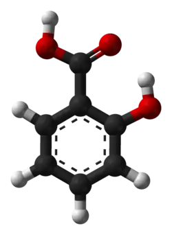 Acidul salicilic are formula C6H4(OH)COOH, unde grupa hidroxil -OH este substituită în poziția orto pe nucleul aromatic față de grupa carboxil -COOH. Astfel, mai poate fi denumit și acid 2-hidroxibenzoic. Este greu solubil în apă (2 g/L la 20 °C).[7] Aspirina (acidul acetilsalicilic) poate fi preparată prin reacția de acilare a grupei fenolice a acidului salicilic cu radicali acetil (care se face cu anhidridă acetică sau clorură de acetil) sau prin reacția Kolbe-Schmitt (vezi „Obținere”).