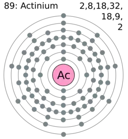 Electronii de pe stratul Q, care completează orbitalul 7s, respectiv unicul electron din substratul d al păturii P reprezintă electronii de valență ai actiniului. Necompletarea substratului d interior al păturii P este o consecință a diferenței energetice a orbitalilor din straturile superioare în acord cu legile mecanicii cuantice.[1][2][26] Substratul d incomplet este o caracteristică comună tuturor elementelor din seria actinidelor.[9][24] Structura proprie a învelișului electronic al atomului Ac determină în mare parte proprietățile fizico-chimice ale speciei atomice.[24] Asemănarea din punct de vedere al arajării electronilor în păturile electronice cu a elementelor din seria lantanidelor explică în mare parte similitudinile fizice ale celor 28 de elemente din cele două serii numite generic pământuri rare.[1][24] Electronii 6d1 și 7s2 aranjați în structura caracteristică actiniului sunt responsabili de majoritatea proprietăților chimice ale speciei atomice.