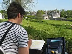 | Modelul: Acuarelistă pictând un peisaj din Ermeton-sur-Biert. | Lucrarea: Acuarelista Marie-Claire Lefébure, (2005) |