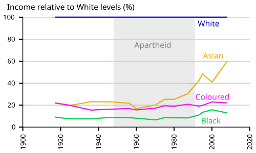 În 1948, Partidul Național a fost ales la putere. Acesta a consolidat segregarea rasială începută sub guvernarea colonială olandeză și britanică. Luând ca model Legea canadiană privind indienii canadieni,[38] guvernul naționalist a clasificat toate popoarele în trei clase de stratificare rasială și a dezvoltat drepturi și limitări pentru fiecare. Minoritatea albă (sub 20% din populație) a controlat marea majoritate neagră.[39] Segregarea rasială instituționalizată legal a devenit cunoscută sub numele de apartheid. În timp ce albii s-au bucurat de mai ridicat nivel de trai din toată Africa, comparabil cu țările occidentale, majoritatea neagră a rămas dezavantajată în aproape orice măsură, inclusiv cu privire la venit, educație, locuință și speranța de viață. Charta Libertății, adoptată în 1955 de Alianța Congresului, cerea o societate non-rasială și încetarea discriminării.