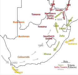 Prin urmare, jumătatea estică a teritoriului prezent al Africii de Sud a fost cucerit de popoarele bantu, cu jumătatea vestică rămânând populată de popoarele băștinașe khoisan până la colonizarea europeană. Acest aspect se vede și în ziua de azi prin răspândirea geografică a grupurilor etnice, cu popoarele bantu fiind în continuare concentrate în jumătatea estică a țării.