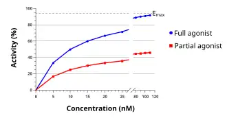 - Agoniștii parțiali (precum buspironă, aripiprazol, buprenorfină sau norclozapin) se leagă și activează și ei un anumit receptor, dar au doar eficacitate parțială comparat cu agoniștii deplini, chiar și atunci când ocupă la maxim receptorii. Agenți precum buprenorfina sunt folosiți pentru a trata dependența de opiacee tocmai din acest motiv, deoarece aceștia produc efecte mai slabe asupra receptorilor opioizi, scăzând astfel dependența și potențialul de abuz.