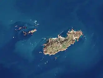 În timpul celui de Al Doilea Război Mondial, Germania Nazistă a ocupat insula, nu înainte ca aproape toată populația să fie evacuată înspre Marea Britanie. Germanii au construit 4 lagăre pe insulă și au folosit mâna de lucru oferită de acestea pantru a fortifica insula. Se estimează la aproximativ 700 numărul deceselor din rândul prizonierilor, înainte de transferul acestora către Germania în 1944. Ulterior facilitățile au fost distruse, dar insula a fost eliberată abia în 16 mai 1945, garnizoana germană staționată aici fiind printre ultimele garnizoane care au capitulat în Europa.