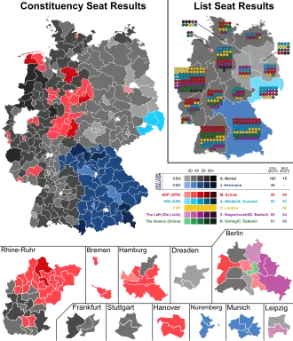 | Uniunea Creștin-Democrată (CDU) | 14,030,751 | 30.2 | 185 | 12,447,656 | 26.8 | 15 | 200 | -55 |