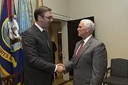 Cu toate acestea, Vučić a fost învestit în funcția de Președinte al Serbiei pe 31 mai, în fața Parlamentului.[24] El a promis să continue reformele și a declarat că Serbia va rămâne pe calea pro-europeană. De asemenea, el a declarat că Serbia își va menține neutralitatea militară, dar continua să lucreze la parteneriate atât NATO, cât și cu Rusia.[25]