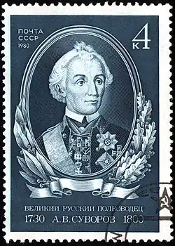 - Aleksandr Vasilievici Suvorov, prinț al Italiei, conte de Rimnik (Râmnic), conte al Sfântului Imperiu German, prinț al Sardiniei, generalisim al forțelor armate terestre și navale ruse, feldmareșal al armatelor austriece și sarde.