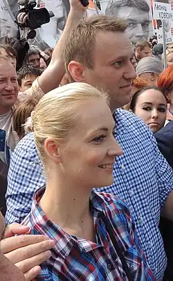 Aleksei Anatolievici Navalnîi (în rusă Алексе́й Анато́льевич Нава́льный; n. , Butîn(d), Moscova, RSFS Rusă, URSS – d. , IK-3 Harp(d), Regiunea Tiumen, Rusia) a fost un jurist, activist și politician rus.[40] Din 2009 a căpătat popularitate în Rusia și în mass-media rusă și cea internațională, criticând corupția și regimul lui Vladimir Putin. El a organizat demonstrații de amploare promovând democrația și condamnând corupția politică din Rusia, „atacându-l” pe Putin și aliații săi. În 2012, The Wall Street Journal l-a descris pe Navalnîi ca fiind „omul de care Vladimir Putin se teme cel mai mult”.[41] În septembrie 2013, Navalnîi a candidat la funcția de primar al Moscovei, pierzând cursa în fața lui Serghei Sobianin (candidatul lui Putin), cu 27% din voturi.[42]