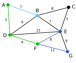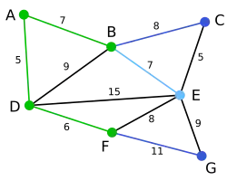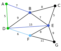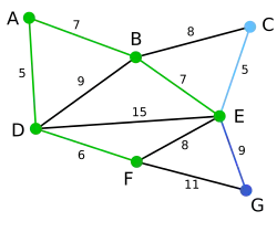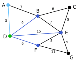 Nodul B, care e la distanța 7 de A, este evidențiat. Aici, muchia DB este evidențiată cu roșu, deoarece ambele noduri B și D au fost deja evidențiate, deci nu poate fi folosită. | null | C, E, G | D, A, F, B |