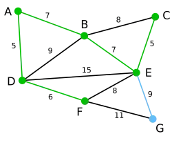 Nodul G este singurul rămas. Se află la distanța 11 față de F și la 9 față de E. E este mai aproape, deci se evidențiază muchia EG. Au fost incluse toate vârfurile, deci arborele parțial de cost minim este evidențiat cu verde. În acest caz, are costul 39. | null | null | D, A, F, B, E, C, G |