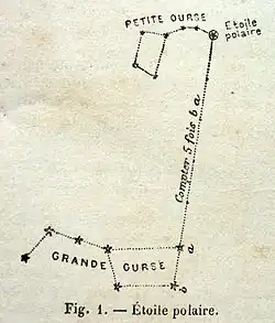 Utilitatea stelei Polaris ca ajutor în navigație (este denumită și Stella Maris[13], „Steaua Mării”) este atestată încă de cele mai vechi scrieri asiriene. Este ușor să găsești Polaris prelungind linia trasată imaginar pornind de la β Ursae Majoris (Merak) prin α Ursae Majoris (Dubhe), cele două stele care formează spatele Carului Mare, caracteristic Ursei Mari, cu „de cinci ori distanța dintre stelele α și β Ursae Majoris.”[14] Sau se poate să se urmeze porțiunea dreaptă a vârfului central al lui „W” din Cassiopeia.