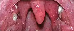 Boala manifestată prin inflamarea, acută sau cronică, a amigdalelor se numește amigdalită.[4] Aceasta se poate recunoaște atât după durerea înțepătoare de la nivelul gâtului, cât și cu ochiul liber, deoarece amigdalele devin roșii, își măresc volumul (angină eritematoasă) și câteodată au pe suprafața lor puncte albe cu puroi, așa numita amigdalită pultacee.[5] Angina pultacee reprezintă evoluția unei angine eritematoase cu apariția de puncte gălbui, mici, cu aspect cremos, depuneri la nivelul criptelor amigdaliene. În cadrul ei se poate descrie abcesul sau flegmonul periamigdalian și abcesul retrofaringian caracterizate printr-o intensă disfagie (dificultate în înghițirea alimentelor), febră și trismus (contracție spastică involuntară a mușchilor mandibulei, care împiedică deschiderea gurii).[6]