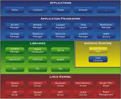 | Mașina virtuală Dalvik | Software-ul scris în Java poate fi compilat în cod mașină Dalvik și executat de mașina virtuală Dalvik, care este o implementare specializată de mașină virtuală concepută pentru utilizarea în dispozitivele mobile, deși teoretic nu este o Mașină Virtuală Java standard. |