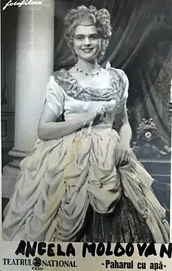 Angela Moldovan (n. , Chișinău, România – d. , București, România) a fost o interpretă română de muzică populară, muzică clasică și romanțe, compozitoare, textieră, actriță de teatru și de film.[2] În anul 1962, cronicarul american Paul Hume a supranumit-o „Privighetoarea României”. În 2002 i s-a acordat Ordinul național „Steaua României” în grad de Cavaler. A fost membru al Uniunii Compozitorilor din Republica Populară Română (în perioada comunistă) și membru UCMR, ADA (Uniunea Compozitorilor și Muzicologilor din România, Asociația pentru Drepturi de Autor). Angela Moldovan este interpreta celebrului cântec „Mi-am făcut bundiță nouă”. A fost prima interpretă a cântecului popular simbol al zonei folclorice a Moldovei – „Trandafir de la Moldova”. A fost căsătorită cu actorul Victor Moldovan, și cu textierul, scenaristul Mircea Block, autorul versurilor a mai multor binecunoscute cântece precum: „Mi-am făcut bundiță nouă”, „Fata neichii”, „Sârba de la Deleni”, „Ia mai zi-i măi fluieraș”, „Merge satul la cules”, „Dorul mă cată pe-acasă”.[3]