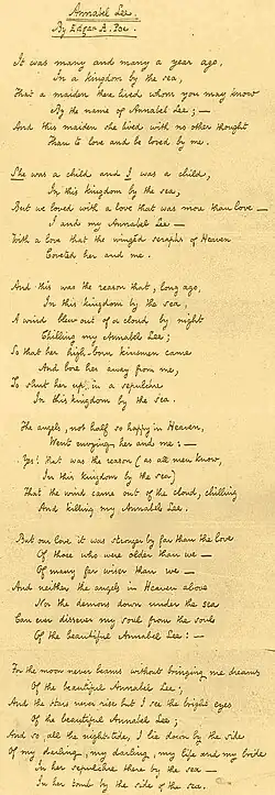 - ↑ "Annabel Lee" – List of texts and variant texts at the Edgar Allan Poe Society online