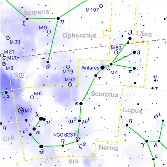 Antares (alfa Scorpii) este cea mai strălucitoare stea din constelația Scorpionul. Denumirea de Antares vine de la grecescul Ant-ares, ceea ce înseamnă „înainte de Marte”.[1]