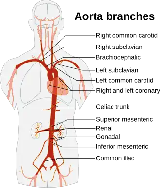 Aorta ( /eɪˈɔrtə/ ay-OR-tə ) este principala și cea mai mare arteră din corpul uman, care își are originea în ventriculul stâng al inimii și se extinde până în abdomen , în unde se împarte in două artere mai mici (arterele iliace comune). Aorta distribuie sânge oxigenat către toate părțile corpului prin circulația sistemică. [1]