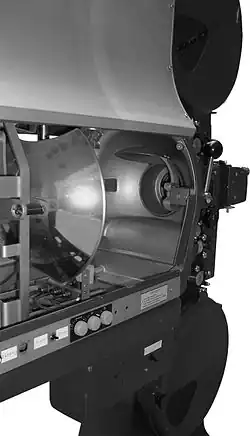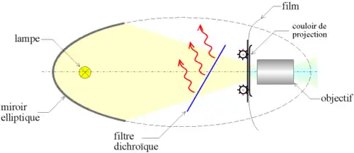 Lumina emisă de sursă este captată de o oglindă sferică, care redirijează razele luminoase către fereastra de proiecție unde întâlnesc filmul străbătându-l ducându-se către ecran prin obiectivul de proiecție. De remarcat că pentru a reduce cantitatea de căldură emanată de sursă, razele luminoase trec inainte de fereastra de proiecție printr-un filtru caloric.