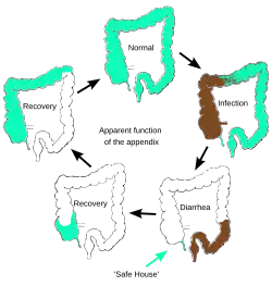 William Parker, Randy Bollinger și colegii de la Universitatea Duke sugerau în 2007 că apendicele slujește ca un adăpost pentru bacteriile utile atunci când boala evacuează acele bacterii din restul intestinelor. Această propunere este bazată pe o nouă înțelegere a felului cum sistemul imunitar suportă creșterea bacteriilor intestinale benefice în combinație cu multe bine-cunoscute caracteristici ale apendicelui, incluzând arhitectura lui, locația lui chiar sub tranzitul unidirecțional al hranei și germenilor în intestinul gros și asocierea lui cu o cantitate copioasă de țesut imunitar. Cercetări efectuate la Winthrop University-Hospital au arătat că indivizi fără apendice erau de patru ori mai predispuși la recidiva cu Clostridium difficile. De aceea apendicele poate juca rolul de „casă sigură” pentru bacteriile comensale („bune”). Acest rezervor de floră intestinală putea apoi servi la repopularea sistemului digestiv după un episod de dizenterie sau holeră.