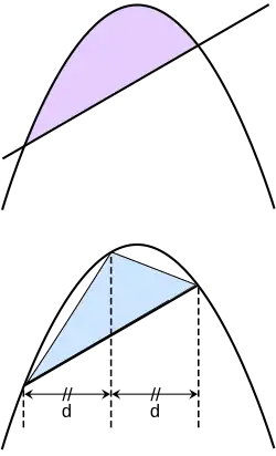 Dacă primul termen al seriei este aria triunghiului, atunci al doilea termen al seriei este suma ariilor a două triunghiuri ale căror baze sunt liniile secante ale triunghiului cu parabola, și așa mai departe.