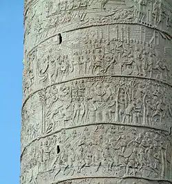 Această formă de sculptură decorează columnele, altarele, arcurile de triumf și alte construcții.Constituie atât un mijloc de propagandă, dar și un veritabil document istoric și aceasta datorită bogăției detaliilor.Astfel de ornamente cu relief istorc întâlnim pe Columna lui Traian, pe Arcul de triumf al lui Titus, pe Columna lui Aurelian etc.