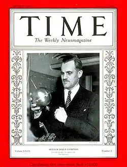 Arthur Holly Compton (n. , Wooster(d), Ohio, SUA – d. , Berkeley, California, SUA) a fost un fizician american, laureat al Premiului Nobel pentru Fizică (1927) pentru descoperirea efectului care îi poartă numele,[19] și care demonstrează natura de particulă a radiației electromagnetice. La vremea aceea, a fost o descoperire senzațională: natura de undă a luminii fusese bine demonstrată, dar ideea că lumina poate avea și proprietăți de undă, și proprietăți de particulă nu era ușor de acceptat. El este cunoscut și drept conducător al Laboratorului Metalurgic al Proiectului Manhattan, și a ocupat postul de cancelar al Universității Washington din St. Louis(d) între 1945 și 1953.