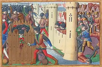 La 21 octombrie a fost atacat zidul (valul) turelei franceze. Primul atac, după o luptă aprigă a fost respins, atacatorii au pierdut 240 de ostași, în timp ce apărătorii 200. După aceasta, englezii au abandonat atacul frontal și au decis să submineze zidul care apăra turela. Această încercare a fost una de succes, apărătorii s-au retras pentru a apăra turela, dar focul de artilerie feroce a făcut apărarea fortificațiilor fără de sens. În noaptea dintre 23 spre 24 octombrie apărătorii au lăsat turela și au aruncat în aer podul. Comandantul cetății cucerite a devenit William Gladsdale. La scurt timp după luarea turelei, Montecute a fost rănit grav în față de schijele provenind de la obuzele artileriei și o săptămână mai târziu a murit.