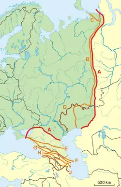 Definiții utilizate pentru granița dintre Asia și Europa în diferite perioade istorice. Definițiile moderne se potrivesc în mare parte cu liniile B și F indicate.