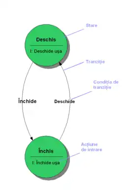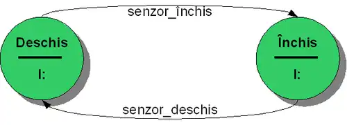 - AF folosește doar acțiuni de intrare de date, adică ieșirea depinde de intrare și de starea curentă. Utilizarea unui AF Mealy conduce adesea la o reducere a numărului de stări. Exemplul din figura 4 arată un automat Mealy care implementează același comportament ca și cel din exemplul Moore (comportamentul depinde de modelul de execuție al AF implementat și va funcționa de exemplu pentru AF virtuale, dar nu pentru AF conduse de evenimente). Există două acțiuni (I:): "pornește motorul care închide ușa dacă sosește comanda cmd_închide" și "pornește motorul în direcție opusă pentru a deschide ușa dacă sosește comanda cmd_deschide".