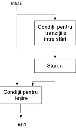 Ieșirea și starea următoare a unui automat finit este o funcție de intrare și de starea curentă. Logica unui AF este prezentată în figura 5.