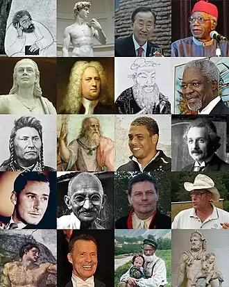 De la stânga la dreapta: Hafez · David · Ban Ki-moon · Chinhua Achebe · Aryabhata · Händel · Confucius · Kofi Annan · Chief Joseph · Plato · Ronaldo · Albert Einstein · Errol Flynn · Mohandas Gandhi · Ole Henrik Magga · Joel Salatin · Adam · Erik Schinegger · Bărbat cu copil · Heracle cu Telephus |