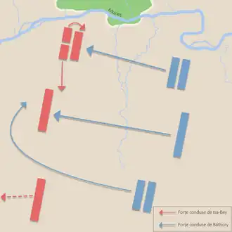 Lupta a fost declanșată de trupele sășești, ale căror comunități au avut cel mai mult de suferit în urma raidurilor otomane, urmate de muntenii aflați în exil care au atacat flancul drept al otomanilor. A urmat atacul în centru, cu cavaleria condusă de voievodul transilvănean, al cărui efect imediat a fost distrugerea unităților muntene și înaintarea până la cea de-a doua linie, unde se afla și liderul otoman. Intervenția rezervelor lui Bali-bey din dreapta a creat o superioritate otomană în centru, trupele lui Báthory fiind în pericol de încercuire. Din fericire însă pentru creștini, liderul otoman, Isa-bey, este ucis în luptă iar situația se mai echilibrează oarecum. De pe partea stângă se aștepta atacul decisiv al lui Ali-bey, însă acesta refuză să intervină. Va motiva ulterior că a încercat o retragere strategică pentru a scoate flancul stâng maghiar de pe câmpul de luptă, însă cronicarii prezenți la bătălie relatează că otomanii, obosiți și derutați de moartea lui Isa-bey, nu au avut curajul să atace trupele regale dotate cu armuri grele complete.[16]