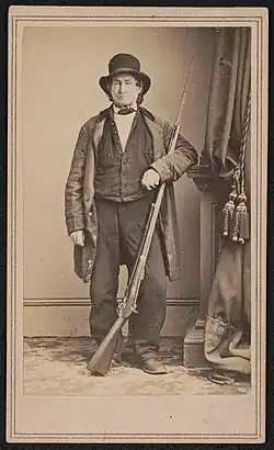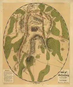 Bătălia de la Gettysburg a fost o luptă de trei zile în cadrul Războiului Civil American între forțele Uniunii(d) și cele ale Confederației(d), desfășurată între și , în orașul Gettysburg, Pennsylvania și în jurul acestuia. Bătălia, câștigată de Uniune, este considerată a fi punctul de cotitură al Războiului Civil(d), care a pus capăt aspirațiilor Confederației de a deveni o țară independentă. A fost cea mai sângeroasă bătălie a Războiului Civil, soldată cu 50.000 de morți de ambele tabere în trei zile.[10]