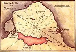 Golful Navarino este un port natural vast pe coasta de vest a Messiniei (în partea de sud-vest al Peloponezului). Are o lungime de aproximativ 5 km și o lățime de 3 km. Gulful este apărat împotriva valurilor mari și a vânturilor de o insulă din apropiere (Sfactiria). Prezența insulei face ca accesul în port să se facă pe două șenale. Cel din mord este mai îngust datorită unor bancuri de nisip, (aproximativ 100 m lățime și doar 18 m adâncime), ceea ce îl face impracticabil pentru vasele de capacitate mare. Cel sudic este mult mai larg de 1.000 – 1.5000 m lărgime. Intrarea sudică era apărată de fortul otoman din Navarino (Pylos). În timpul Războiului de Independență al Greciei, portul a fost folosit de marina otomană ca bază operațională principală în Peloponez. O flotă numeroasă otomano-egipteano-algeriană, care fusese avertizată de britanici și francezi să nu se apropie de Grecia, a părăsit Alexandria pe 5 august 1827 și s-a alăturat vaselor otomane deja aflate în portul Navarino pe 8 septembrie[26]. Ca urmare, Codrington s-a deplasat cu escadra sa la Navarino pe 12 septembrie. În discuțiile cu Ibrahim Pașa de pe 25 septembrie, Codrington a primit asigurări verbale că otomanii vor înceta acțiunile navale și terestre din Grecia[27]. După aceste discuții, Codrington și-a retras forțele de sub comanda sa în apele insulei Zakynthos aflată sub control britanic, lăsând doar o fregată la Navarino să țină sub observație flota otomană.