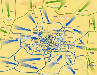 ![]() Harta avansului FDS în Raqqa în timpul bătăliei teritoriu controlat de FDS | ||||||||