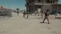 - ↑ Deși în articol sunt numiți membri ai unor unități neidentificate ale Armatei Siriene Libere, luptătorii în retragere pot fi identificați în fotografii[25] ca membri ai Forțelor de Elită datorită emblemei de pe braț.[26]