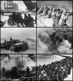 ![]() În sens orar de sus în jos:(1) Tun sovietic de 76,2 mm în poziție de tragere;(2) Soldați ai Armatei Roșii pe acoperișul unei case;(3) Ju 87 german după un bombardament în plonjon;(4) Prizonieri de război germani, italieni, români, maghiari;(5) Soldați sovietici luptând într-un atelier distrus;(6) Sturmgeschütz III german în mișcare. | |||||||
