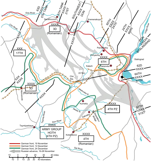Pe 20 noiembrie, o a doua ofensivă sovietică a fost lansată la sud de Stalingrad, în zona apărată de Armata 4-a Română. Această armată, compusă în principal din unități de cavalerie, a cedat aproape imediat. Forțele sovietice și-au continuat înaintarea către vest într-o mișcare de învăluire, făcând joncțiunea lângă orașul Kalaci după două zile, încercuind fără scăpare forțele Axei. Aproximativ 250.000 de soldați germani, 30.000 de soldați români și italieni, ca și câteva unități croate și o serie de unități auxiliare de voluntari au fost prinși în acestă încercuire. Alături de ei s-au aflat și civili sovietici și câteva mii de soldați sovietici căzuți prizonieri în luptele cu germanii. Nu toți germanii au fost încercuiți, aproximativ 50.000 au rămas în afara pungii.
