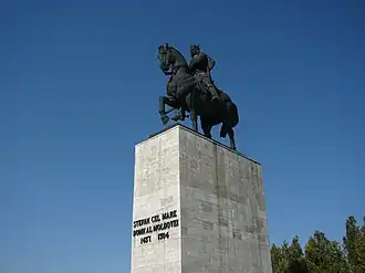 - În anul 1975 a fost dezvelită statuia ecvestră a lui Ștefan cel Mare de la Podul Înalt din ansamblul monumental Podul Înalt, cu prilejul împlinirii a 500 de ani de la victoria moldovenilor conduși de Ștefan cel Mare. Statuia este amplasată pe un soclu înalt de 8 metri, îmbrăcat în marmură, la capătul unui lung șir de trepte, de asemenea învelite în marmură. Realizată din bronz, operă a sculptorului Mircea Ștefănescu, statuia are înălțimea de 6,90 metri, și o greutate de 19 tone. La baza ansamblului monumental se află două basoreliefuri, realizate de asemenea din bronz, prezentând una o scenă în care voievodul primește solia turcilor și cealată o scenă în care Ștefan se află în mijlocul oamenilor de rând.