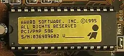 BIOS-ul este de obicei stocat într-un chip cu 32 de pini, care poate fi identificat de un autocolant argintiu sau auriu, care arată numele companiei BIOS, (AMIBIOS, AWARD sau Phoenix), și un cod care indică versiunea codului. Dacă are formă dreptunghiulară, se numește un chip DIP (Dual In-line Package). Plăcile de bază mai vechi pot avea chip DIP BIOS cu 28 de pini. Dacă cipul BIOS este pătrat cu conexiuni pe toate cele patru laturi, acesta se află într-un pachet PLCC (Plastic Leaded Chip Carrier).[6]