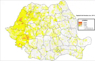 Baptiștii au apărut în România încă din secolul al XIX-lea.[3] Din 1919 bisericile baptiste au format Uniunea Comunităților Creștine Baptiste din România, libertatea cultului fiind recunoscută prin lege.[3] În 1930 comunitatea baptistă din România ajunsese la peste 60.000 de membri, iar în 1942 la peste 90.000.[3] În perioada comunistă numărul baptiștilor a fost ținut sub control, însă a continuat să crească după 1989,[3] ajungând, conform ultimului recensământ la 103.213 de adepți.[4]