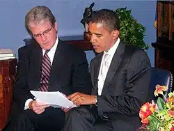 - ↑ Dorning, Mike (). „Obama Reaches Across Decades to JFK”. Chicago Tribune. Arhivat din original (paid archive) la . Accesat în . Vezi și: Harnden, Toby (). „Barack Obama is JFK Heir, Says Kennedy Aide”. Daily Telegraph. Accesat în .