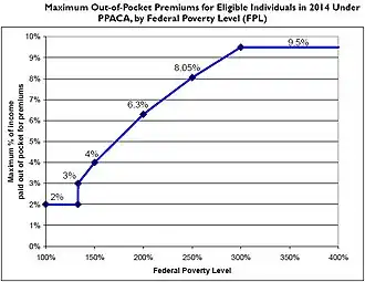 ACA cuprinde stipulări legate de sănătate care urmau să intre în vigoare de-a lungul a patru ani, inclusiv extinderea eligibilității pentru Medicaid(en)[traduceți] la persoane aflate și cu 33% dincolo de pragul federal al sărăciei începând cu 2014,[246] subvenționarea asigurării medicale pentru persoane al căror venit este cel mult de patru ori mai mare decât pragul federal al sărăciei (88.000 de dolari pentru o familie de patru persoane pe tot anul 2010) astfel încât plata maximă pe care trebuie să o efectueze ei anual pentru asigurare să se încadreze între 2 și 9,5% din venit;[247][248] stimulente pentru firme pentru a oferi angajaților beneficii sub forma asigurărilor medicale, interzicerea refuzului de a plăti costurile îngrijirii pe baza afecțiunilor preexistente; stabilirea schimburilor de asigurări medicale; interdicția plafonului anual de despăgubire; și susținere pentru cercetarea medicală. Conform cifrelor furnizate de Oficiul pentru Buget al Casei Albe și Congresului, ponderea maximă în cadrul venitului celor înscriși variază în funcție de venitul lor relativ la pragul federal al sărăciei.[247][249]