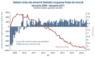 Ca și de-a lungul anului 2008, rata șomajului a crescut în 2009, ajungând în octombrie la un maxim de 10% și o medie de 10% în al patrulea trimestru. După o scădere la 9,7% în primul trimestru din 2010, rata șomajului a scăzut la 9,6% în al patrulea trimestru, unde a rămas tot restul anului.[214] Între februarie și decembrie 2010, șomajul a crescut cu 0,8%, mai puțin decât media de 1,9% din timpul perioadelor similare din perioadele anterioare de revenire a șomajului.[215] Până în noiembrie 2012, rata șomajului a scăzut la 7,7%,[216] scăzând apoi la 6,7% în decembrie 2013.[217] În 2014, rata șomajului a continuat să scadă, până la 6,3% în primul trimestru.[218] Creșterea PIB a revenit în al treilea trimestru din 2009, cu o rată de 1,6%, urmată de o creștere la 5% în al patrulea trimestru.[219] Creșterea a crescut și în 2010, cu 3,7% în primul trimestru, și cu creșteri mai mici în restul anului.[219] În iulie 2010, Rezerva Federală a consemnat continuarea creșterii activității economice, dar într-un ritm scăzut, iar președintele Ben Bernanke a afirmat că perspectivele economice sunt „neobișnuit de incerte”.[220] În ansamblul ei, economia a crescut într-un ritm de 2,9% în 2010.[221]