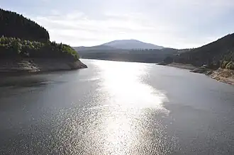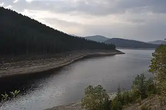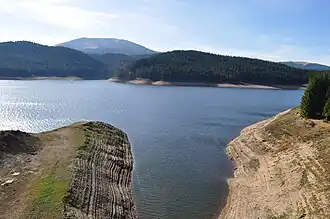 Lacul Oaşa şi Vârful lui Pătru Acumularea Oașa, realizată în spatele barajului din cheile cu același nume.
