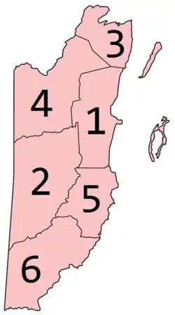 ![]() | Districtul Belize Districtul Cayo Districtul Corozal Districtul Orange Walk Districtul Stann Creek Districtul Toledo |
