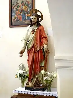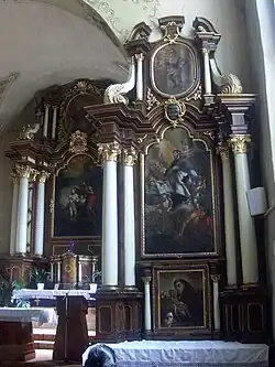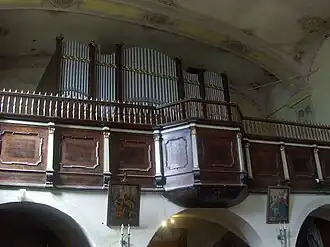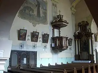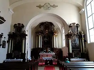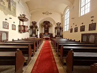Tavanul navei este sprijinit pe bolți de factură barocă. Amvonul și cele trei altare au fost realizate de asemenea în stil baroc, în anul 1729.[6]
