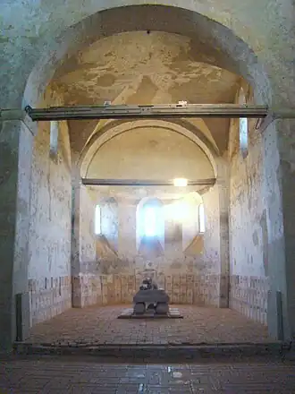 Bazilica are un cor pătrat ce este boltit pe arce frânte în timp ce o semicalotă acoperă absida principală semicirculară. Pe peretele sudic al corului se regăsește o ușă, în prezent zidită, pe care privirea descoperă urme de pictură murală. Cu toate că altarul bisericii a fost demontat, se mai păstrează un fragment sculptat din nișa centrală, fragment datat din anul 1425, care o înfățișează pe Fecioara Maria și care se află în prezent la Muzeul Brukenthal din Sibiu. De asemenea au fost pictate o mulțime de cruci de consacrare în mai multe părți ale bisericii.[5]